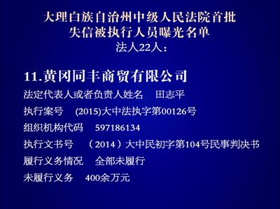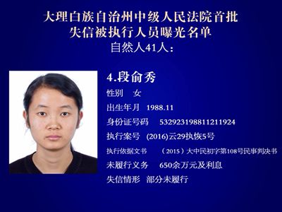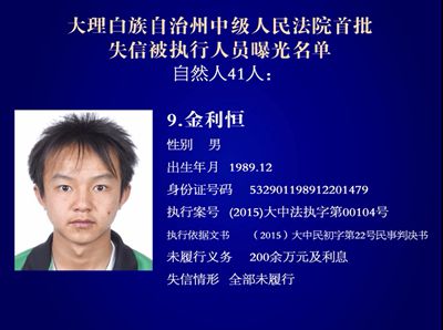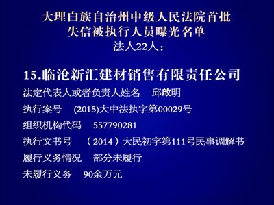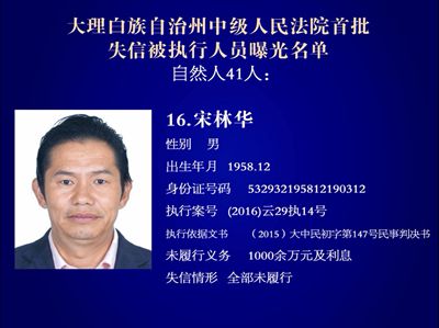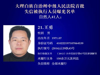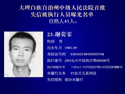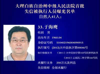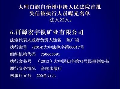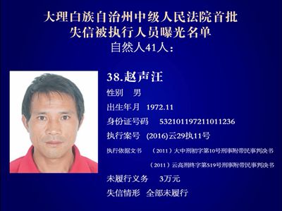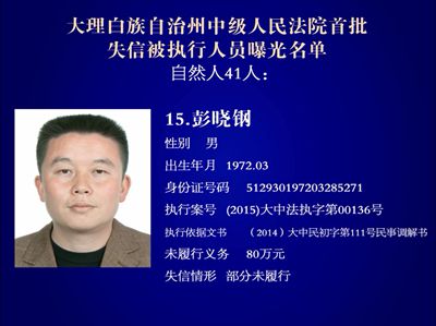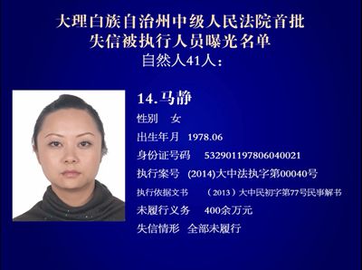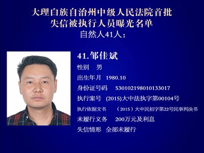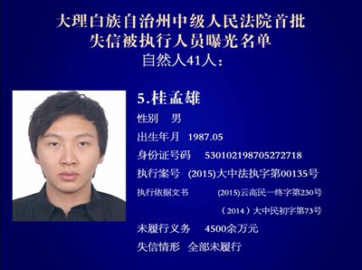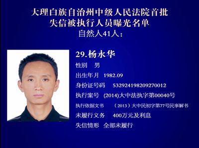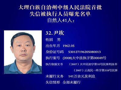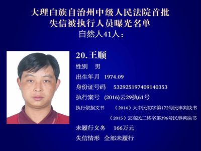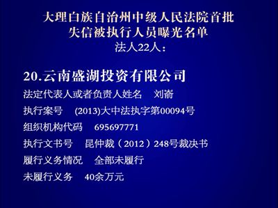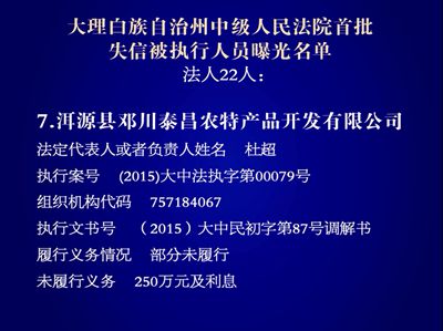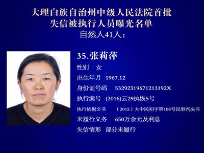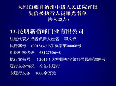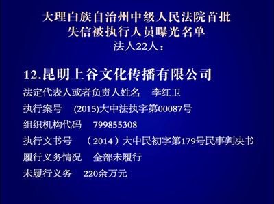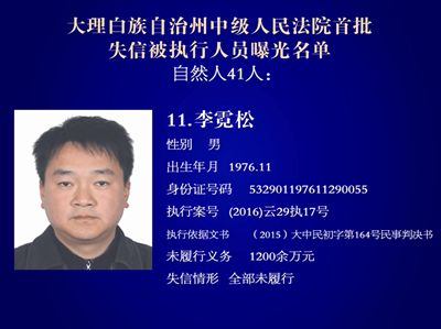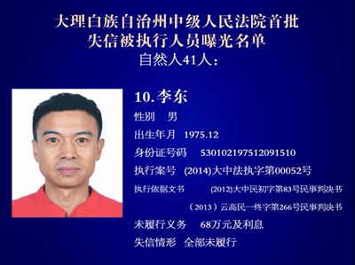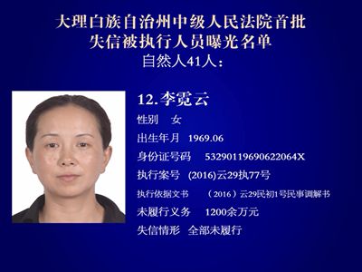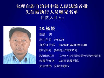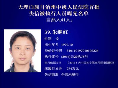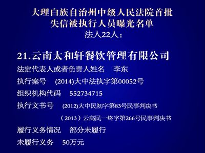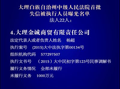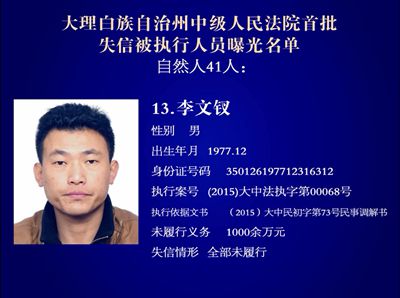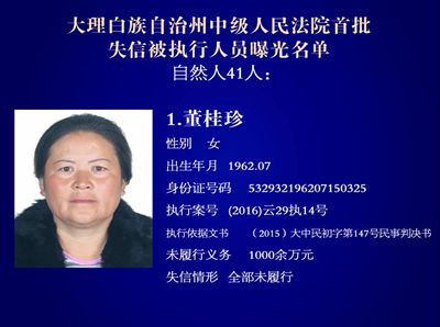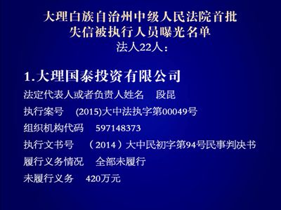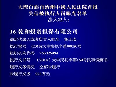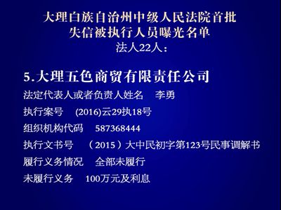 大理白族自治州中级人民法院首批失信被执行人曝光名单